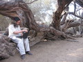 RMS outside on a lush rocky hill with his laptop.
